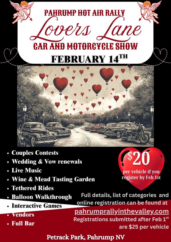 Rev your engines and let your heart soar at the Pahrump Hot Air Rally Lovers Lane Car and Motorcycle Show on Valentine's Day, February 14th, 2026!